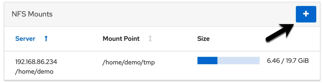 To mount a remote filesystem, click on the ‘+’ button highlighted above and enter information about the remote NFS server and file system share together with the local mount point and any necessary options into the resulting dialog before clicking on the Add button: