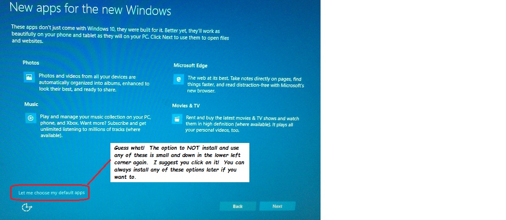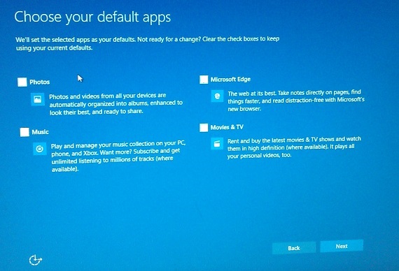 On the next page I would recommend clicking on the small "Let me choose my default apps" option in the lower left corner.