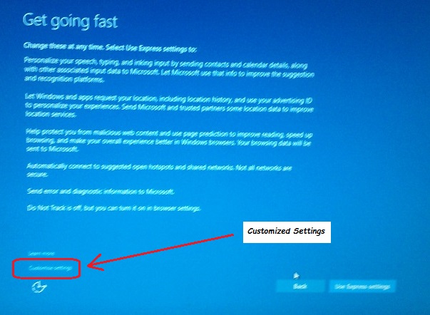 it will bring you to a big blue screen that says, "Get Going Fast". And Microsoft really wants you to go fast and not spend time reading what's on the screen.