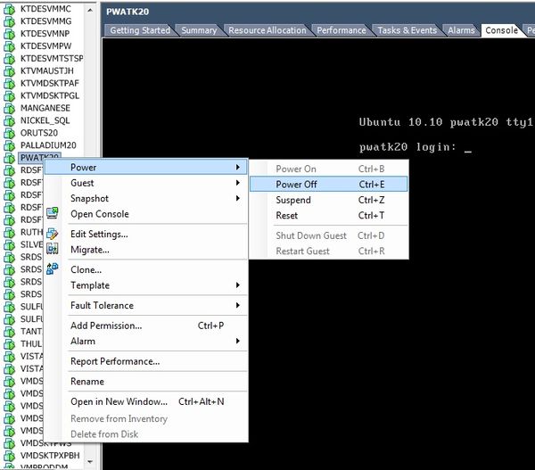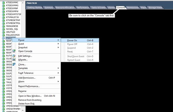 If you do not already have the "Console" opened, click on the "Console" tab now. Then right-click on your server again and choose Power > Power On to power it up.