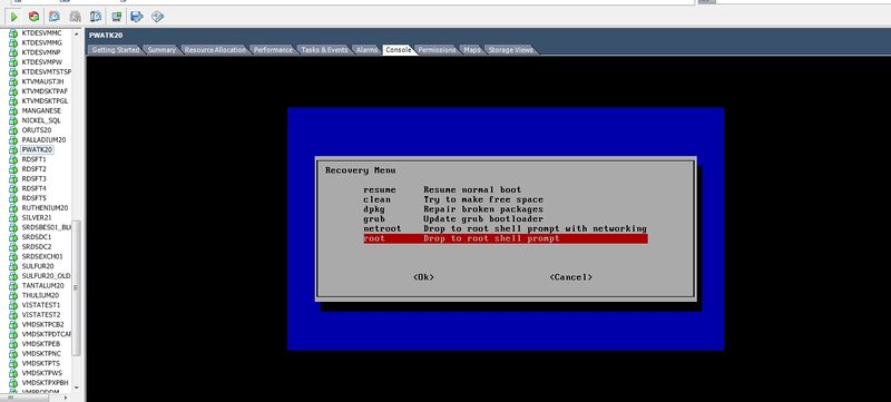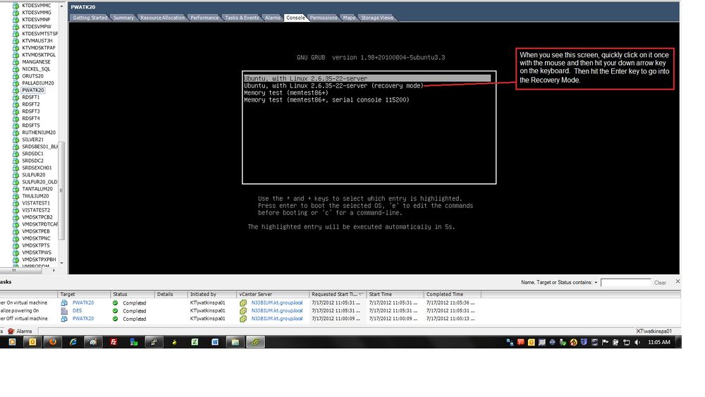 Be ready with your mouse arrow and a finger over the down arrow key on your keyboard. As soon as you see the menu screen below, click once with your mouse anywhere in the console window, and then hit the down arrow key, right away, once. With the second item highlighted ("recovery mode"), hit Enter.