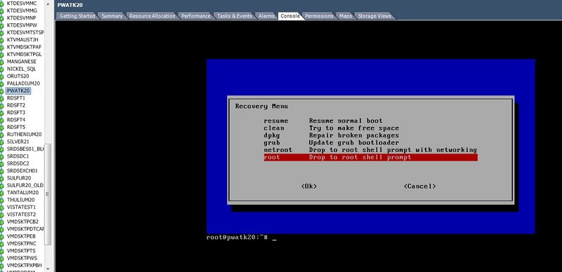 And then after a few seconds the recovery mode menu will display. Arrow down to the last item ("Drop to root shell prompt") and hit Enter. (or the root shell with network, as needed)