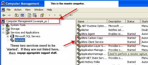 Make sure that the "Altiris Carbon Copy" and "Altiris Client Service" are "started".