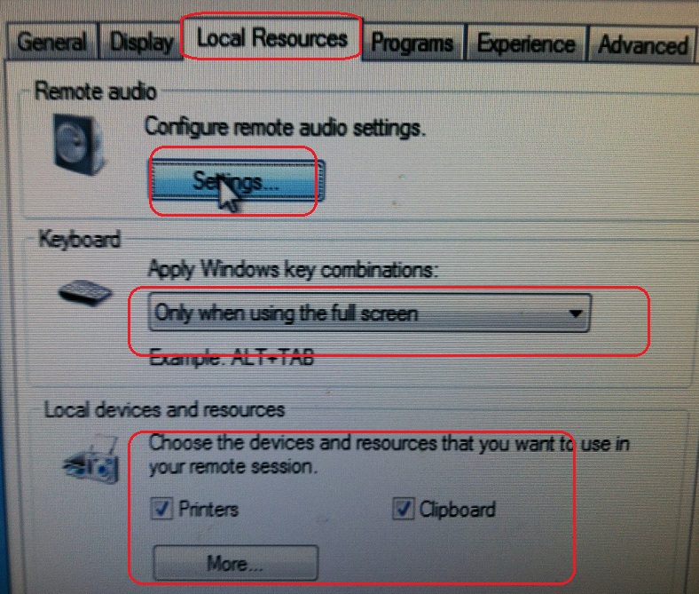 3. In the "Local Resources" tab configure the options as desired.