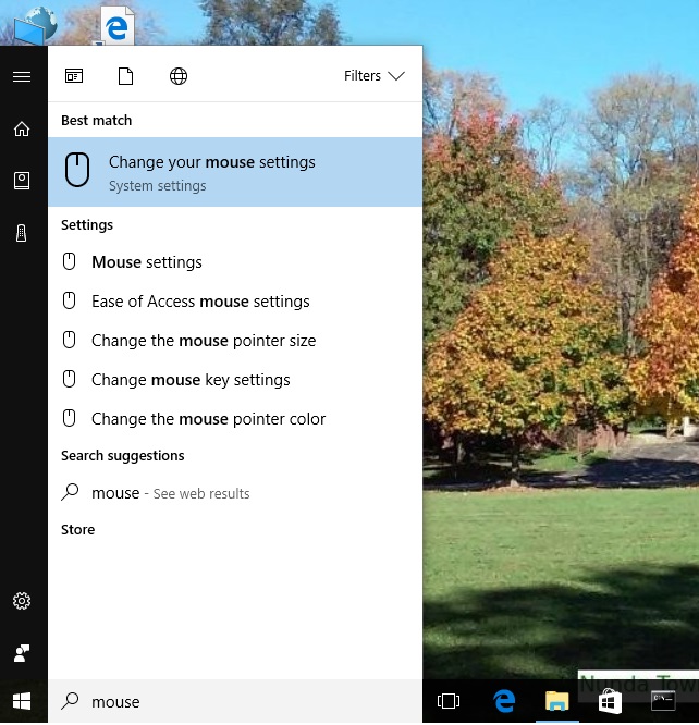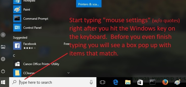 2. Start typing the words "mouse settings" (w/o the quotes). Before you even finish typing both words, you'll see a box pop up with suggestions.