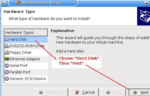 5. Choose "Hard Disk" from the "Hardware Types" list. Then click on "Next".
