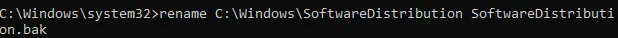 - Type “rename C:\windows\SoftwareDistribution SoftwareDistribution.bak” then hit Enter.