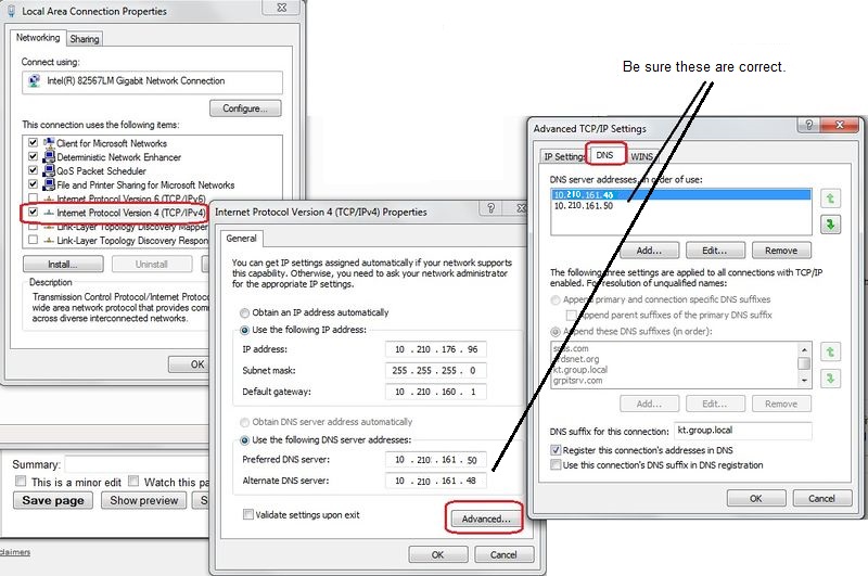 000082 | User is trying to get to certain web sites that others can get to. They can get out onto the internet ok, but certain Intraweb sites fail. Error says something like "Connection with the server could not be established". | The TCP/IP configuration is not correct. Older settings for the "Gateway" and "DNS" settings in the TCP/IP configuration are set instead of newer settings. This explains to some degree why not all sites are blocked. | Remove any gateway ip addresses and enable DNS, putting in the correct Domain, the correct Domain Suffix Search Order , and a host name. |