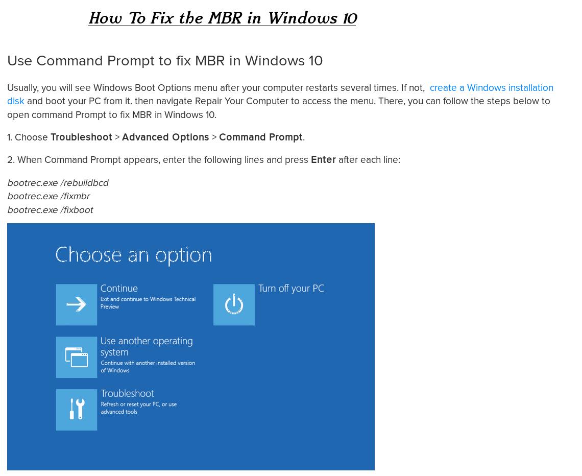 2. Reboot the computer with a Windows install DVD or USB stick. 3. Choose to repair Windows instead of the default "install". 4. Pick the "Troubleshooting" option. 5. Pick the option to go to a command prompt. 6. Run these 5 commands and then reboot. - bootrec /FixMbr - bootrec /FixBoot - bootrec /FixMbr /ScanOs - bootrec /RebuildBcd - exit |