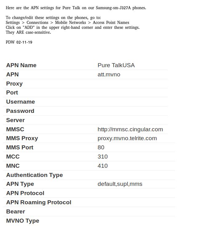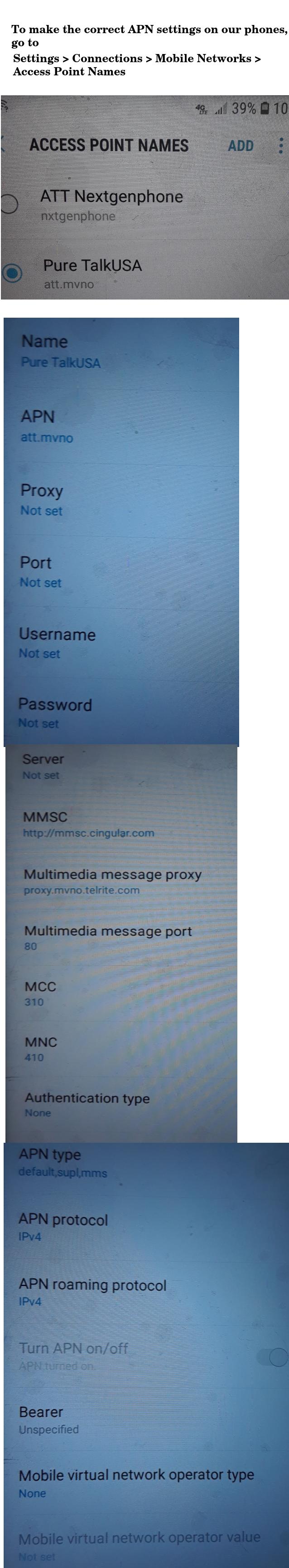 After my Android phone got an automatic update my incoming texts with pictures would not display or download. I backed everything up and did a factory reset, but that did not fix the problem. | Somehow the update messed up the APN settings and then the factory reset removed correct APN setting and defaulted to AT&T APN settings. | On my phone I opened up Settings > Connections > Mobile Networks > Access Point Names and added a Pure TalkUSA item and then copied Lois' Pure TalkUSA settings and checked this as my APN in place of the AT&T APN.