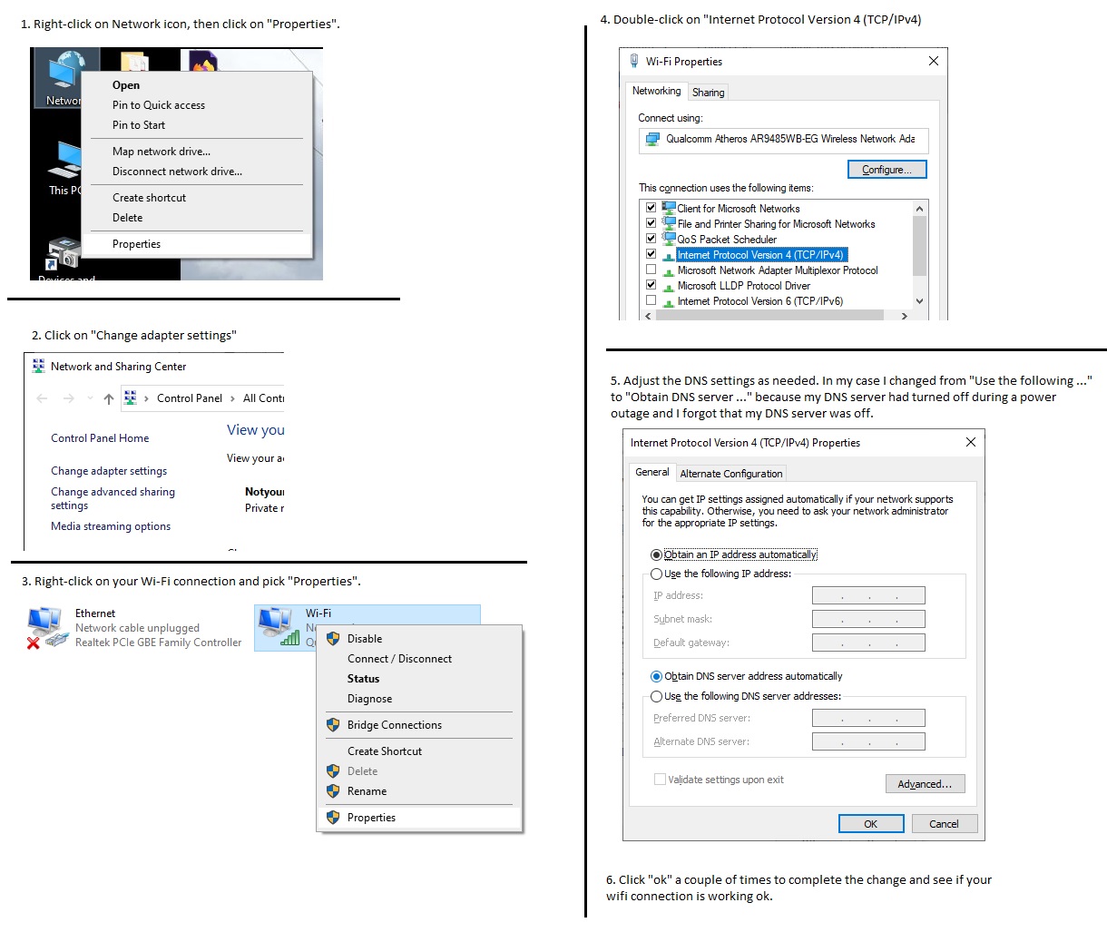 One of my laptops connected to my network, but failed to connect to the internet. | My DNS server had been turned off by a recent power outage in our house and I forgot that it was affected (turned off) by the outage. | Here's what I did (and then afterward realized my DNS server was not on). fix-internet.jpg |