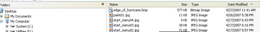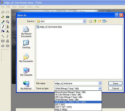 Now leave Paint open but Alt + Tab back to Explorer. Press the F5 function key in Explorer to refresh the list. You should now see both files, "edge_of_hurricane.bmp" and "edge_of_hurricane.jpg". Notice the difference in size? The new *.jpg version is about 21Kb in size. Quite a bit smaller than the *.bmp version. And they both look the same whether you open them in Paint, paste them in Word, or use them in a webpage like this.