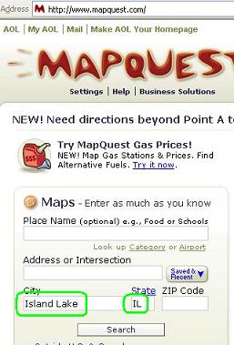 Open your browser and go to www.mapquest.com. Now open Paint (Start > All Programs > Accessories > Paint). Then Alt + Tab back to your browser. On the Map Quest site type "Island Lake" in the "City" box and "IL" and the "State" box. Then click on the "Search" button.