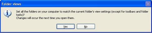 Menu bar and click on "Tools > "Folder Options". Click on the "View" tab, then click on the "Apply to All Folders"